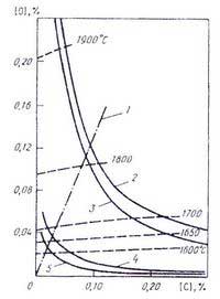 т. е. равновесие реакции при вакуумировании сдвигается вправо, продувка кислородом вызывает дальнейший сдвиг равновесия и обеспечивает еще большее снижение содержания [С].